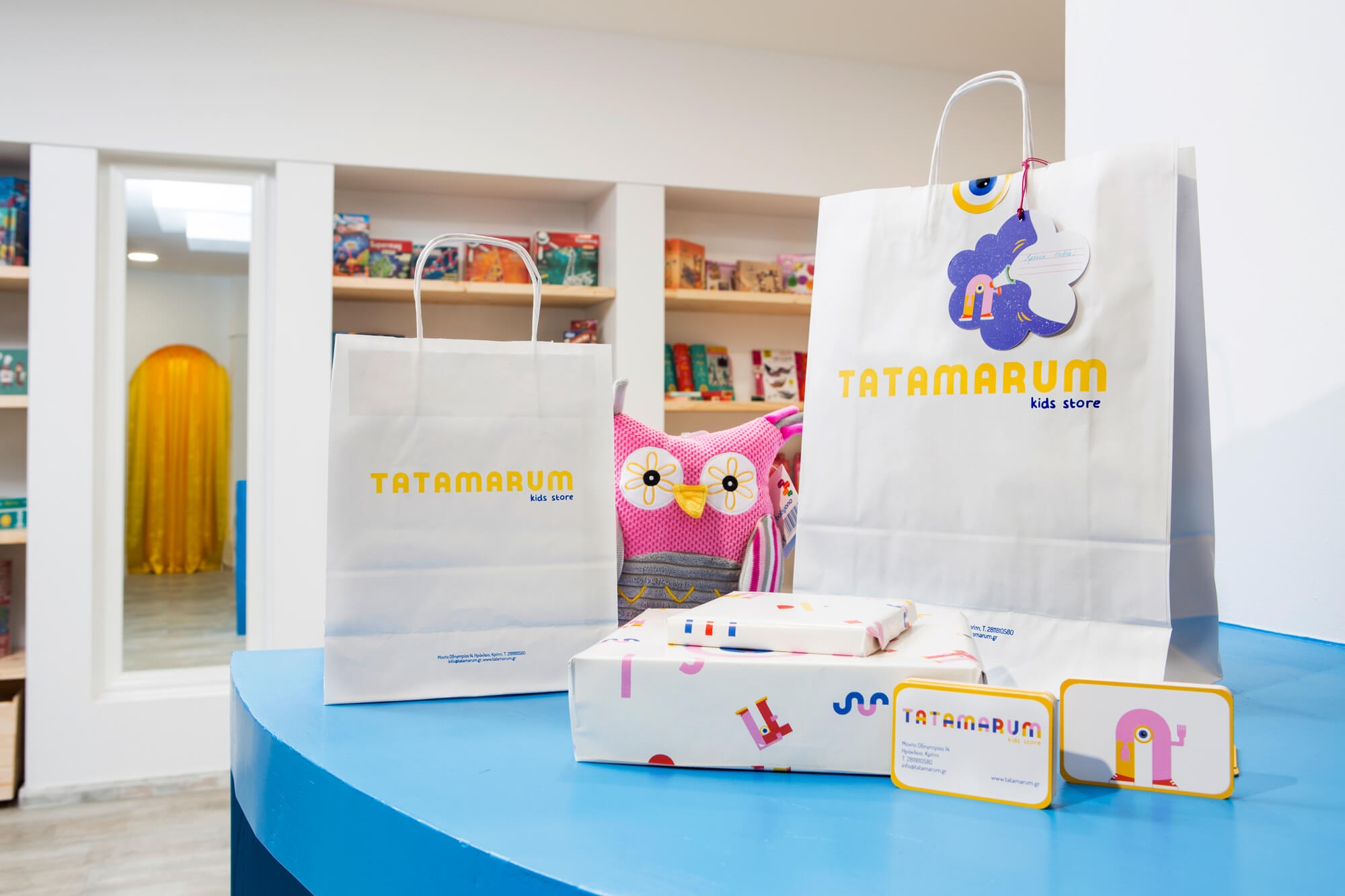 Tatiana and Maria decided to open a unique store for children. The choice of the name TATAMARUM came from the combination of their names. The basic concept in brand design was to create a playful logo that appears to be assembled using colored pieces. By extracting the letter A from the logo, we have developed a character with plasticity and movement. The mascot complements the logo and, through its flexibility and dynamic nature, undergoes seasonal transformations to meet the brand's communication requirements. The logo was designed with vibrantcolors and strong typography. The vibrant color palette used in the logo and the mascot was developed and adapted for various applications.We developed the comprehensive visual identity for the company, encompassing digital and print applications.