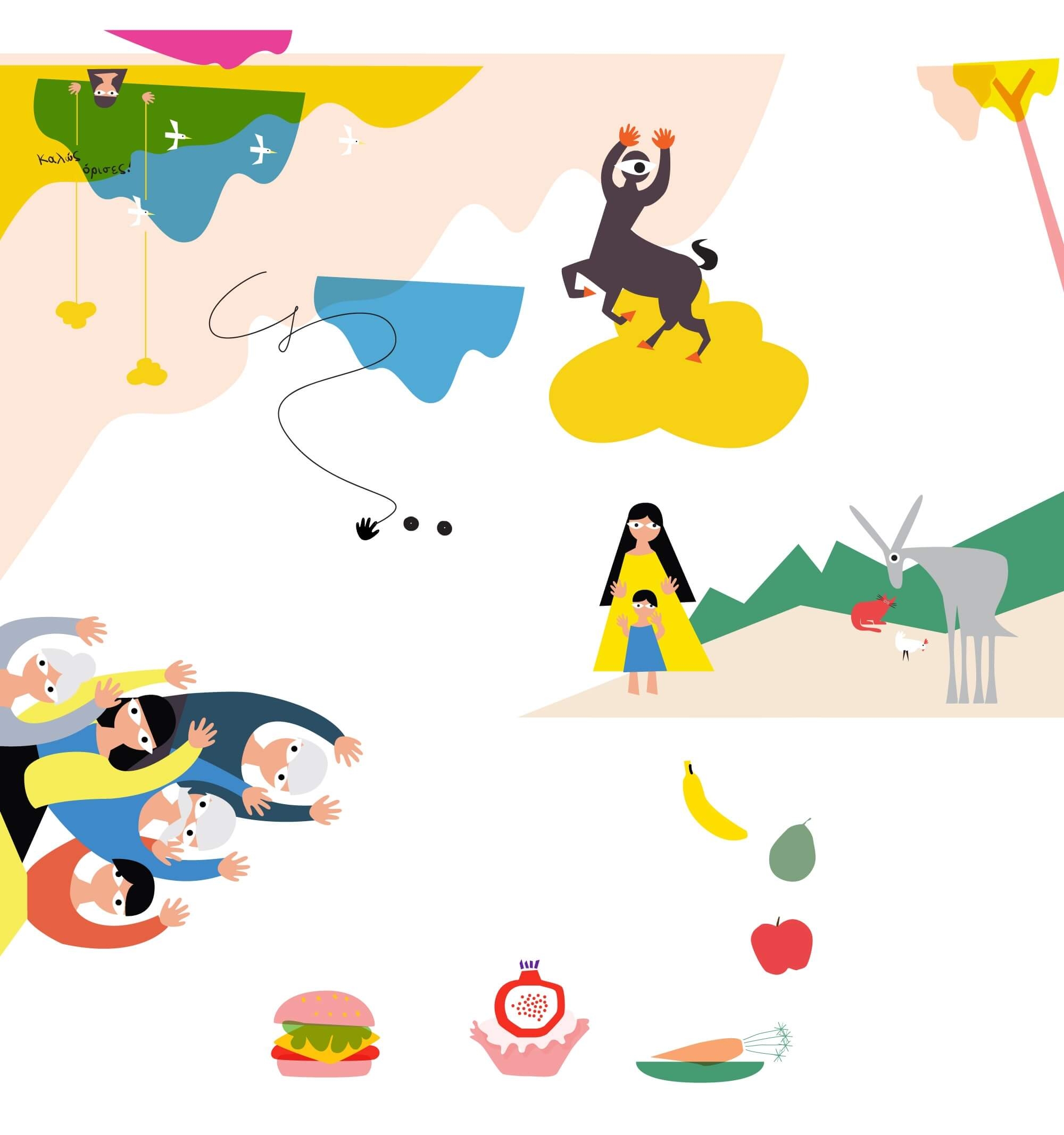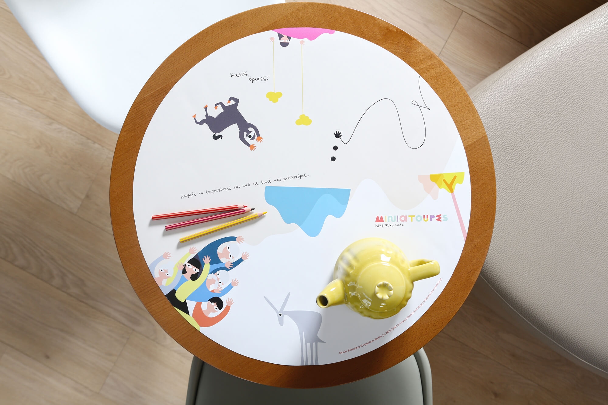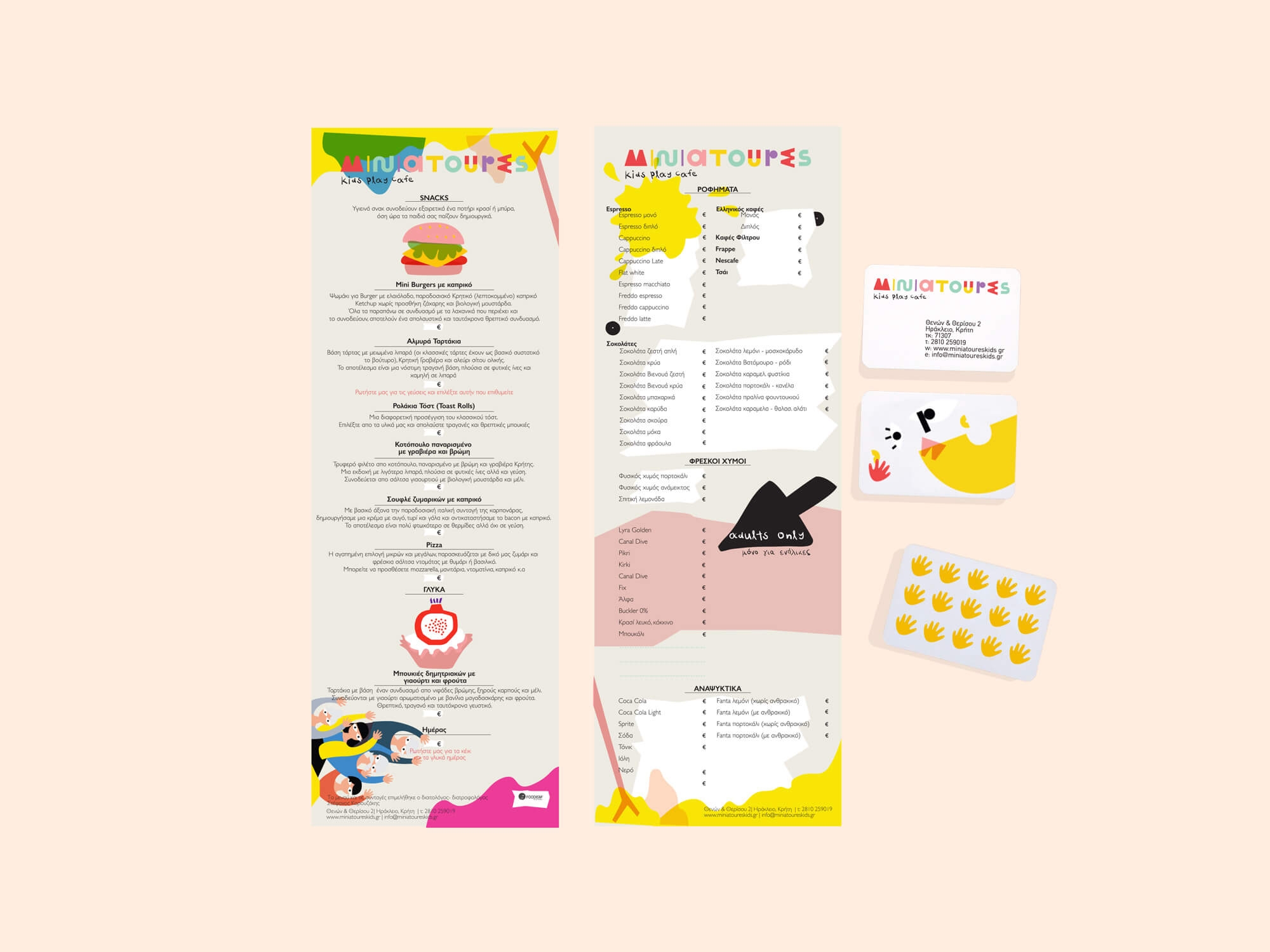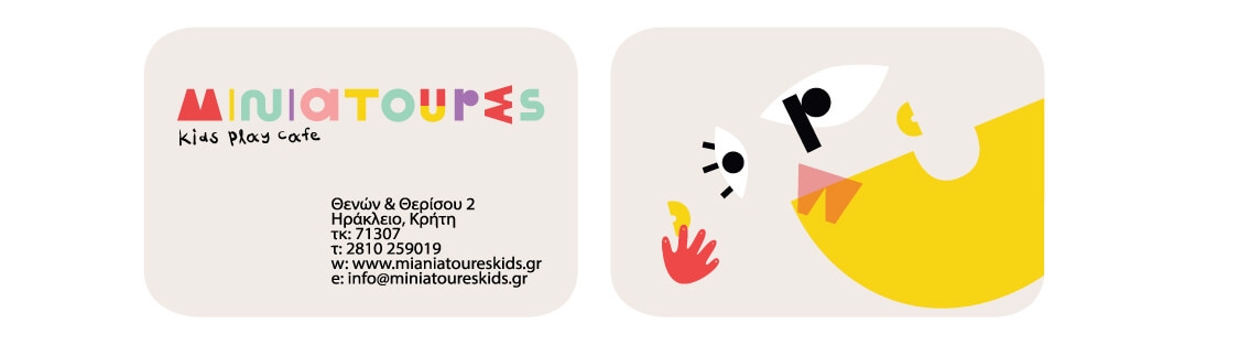 Logotype and identity design for the alternative cafe "Miniatoures." The main idea focuses on the style of the cafe itselfby projecting the feeling that Miniatures is a creative space for play. It is a quiet retreat for children and adults, a kids' art café, and a meeting point for the neighborhood. A place where kids and their parents can play and relax together. The logo was designed using a combination of colors and improvised typography, inspired by playful activities involving colors, collage, and shapes. The exterior graphics are based on illustrated stories of Greek culture and tradition.